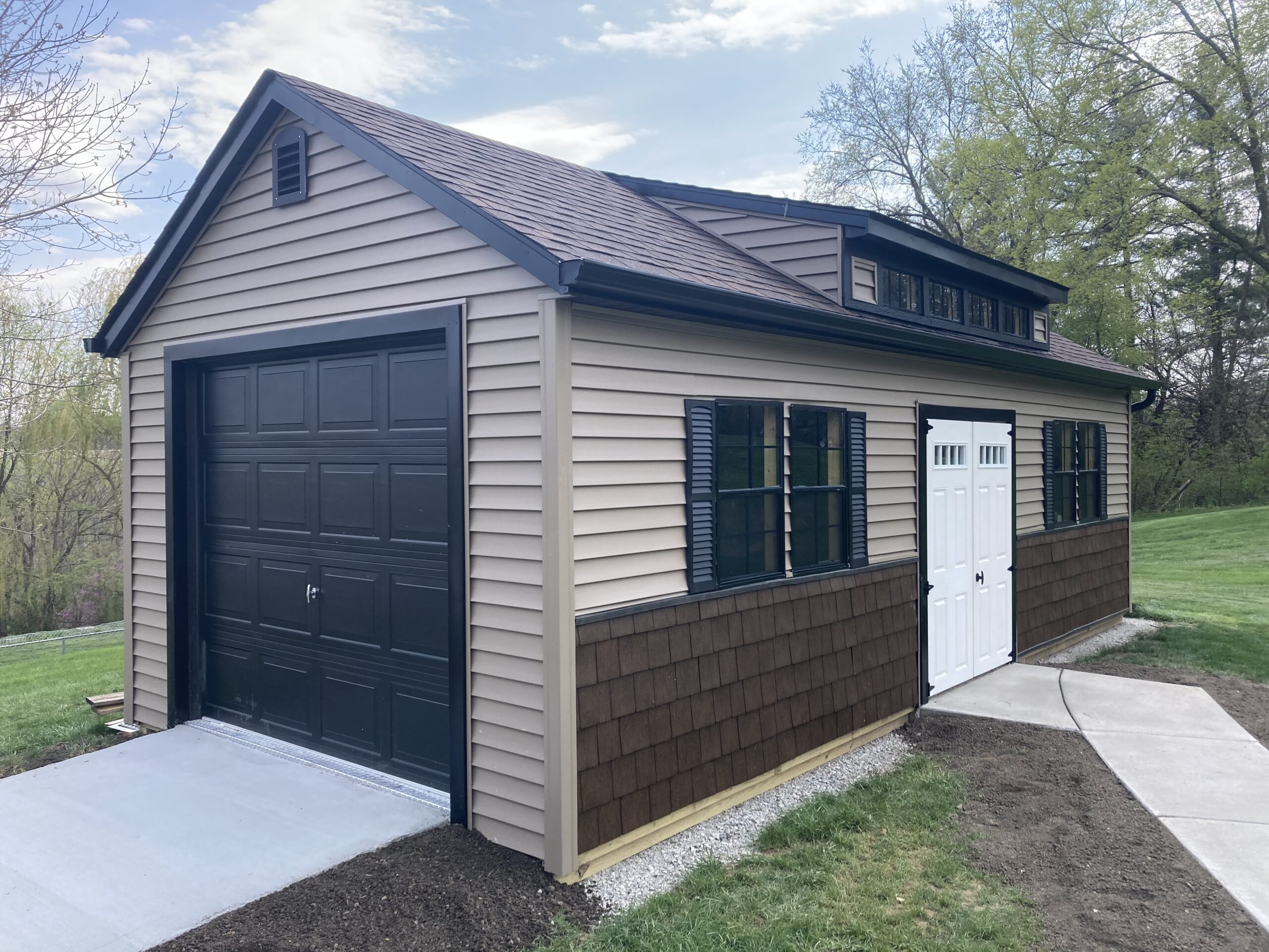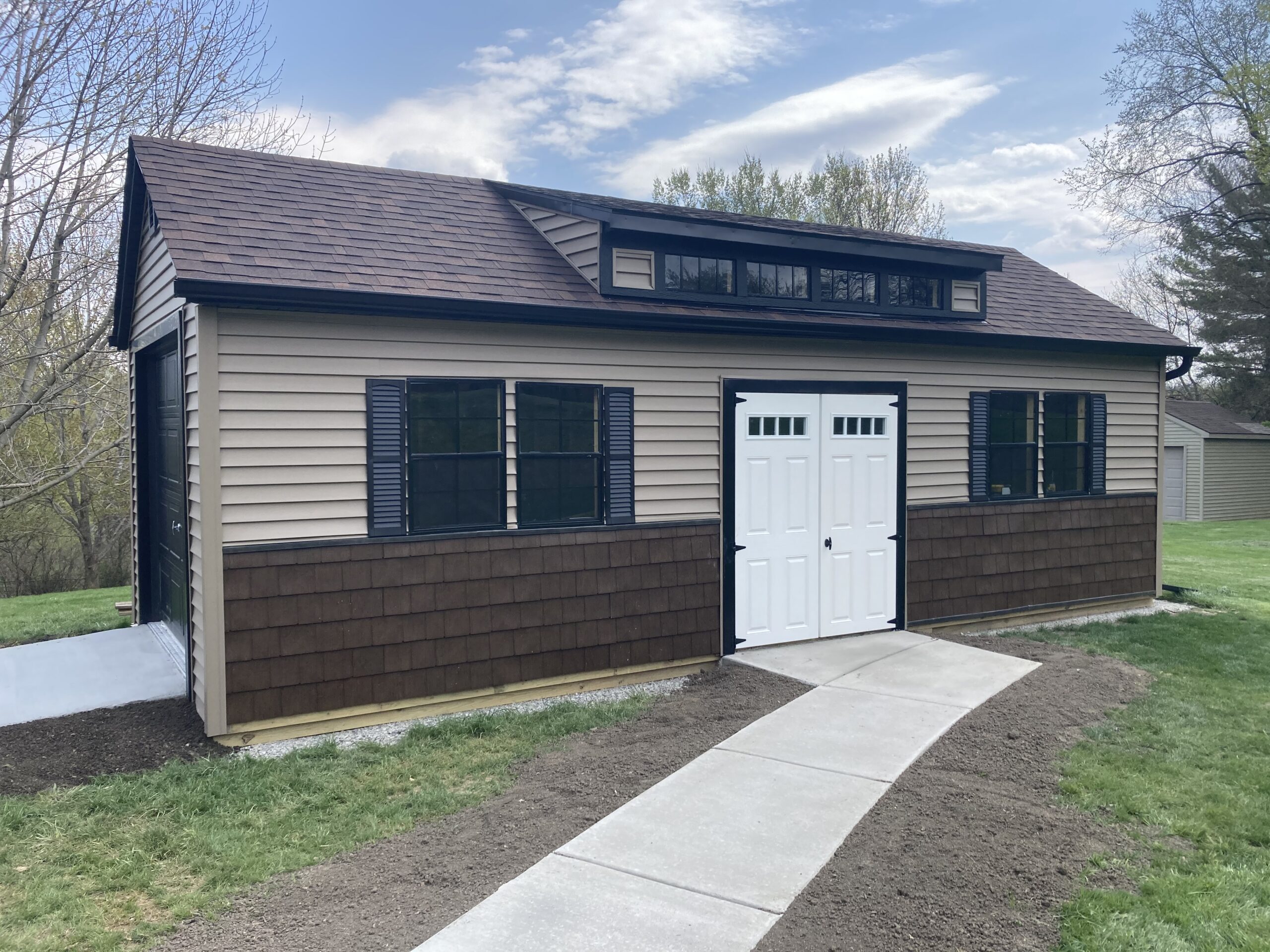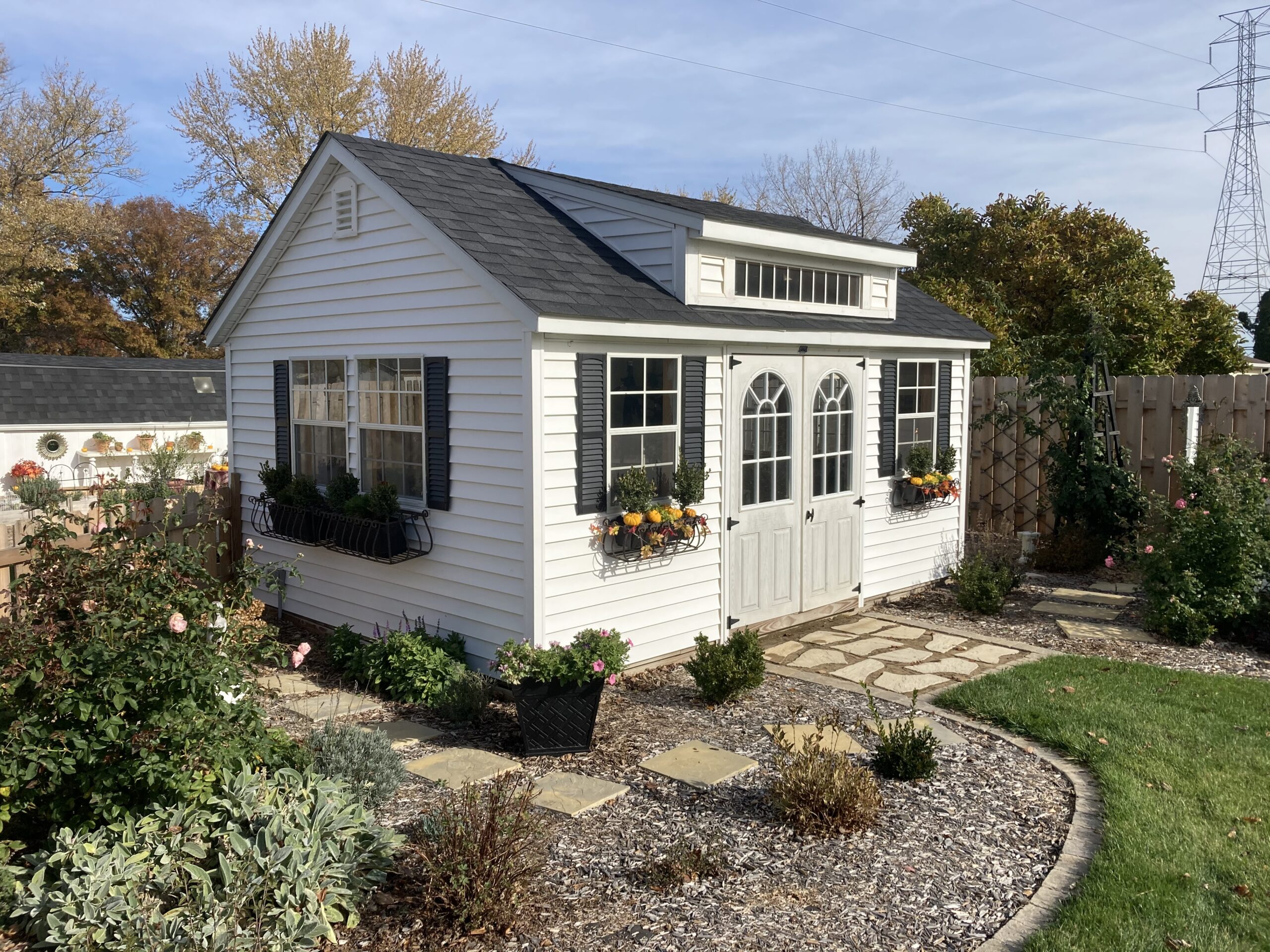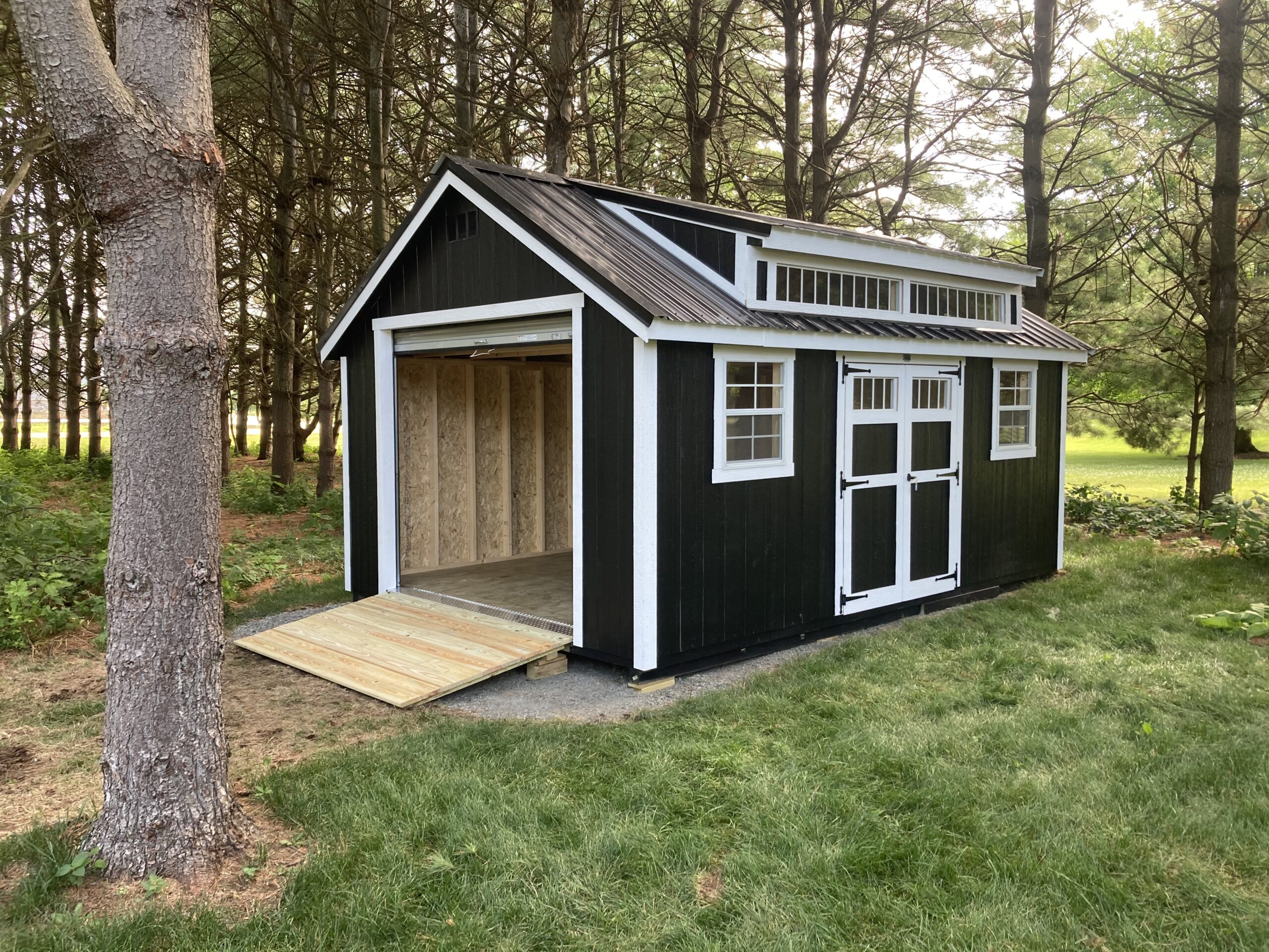 It comes with or without a windowed dormer. Either shed will give you a cottagey look and also provide overhead storage. These sheds come with one 5’ wide opening with double doors, one 30” walk-in door, two 24”x27” windows. Call for pricing.